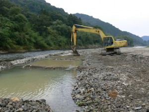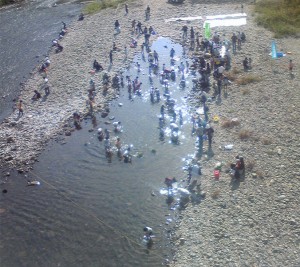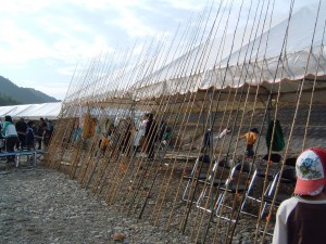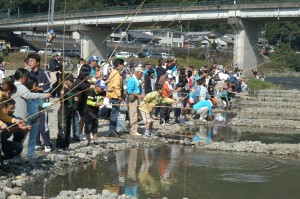 北川町の建設業組合の方々の協力で、5m×5mの池を20面作り、つかみ獲り・チョン掛け用の池2面を河川120mの中に作成していただき、魚釣り大会を行いました。