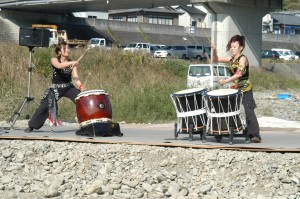 並行して延岡市生活環境課による水辺の生き物調査、チームのぼり猿によるのぼる君とのジャンケン大会、アミータさんによるドラムサークルが行われ、お昼には日本赤十字延岡奉仕団による、おにぎりや豚汁、釣ったばかりの魚の串焼きなどが振舞われました。