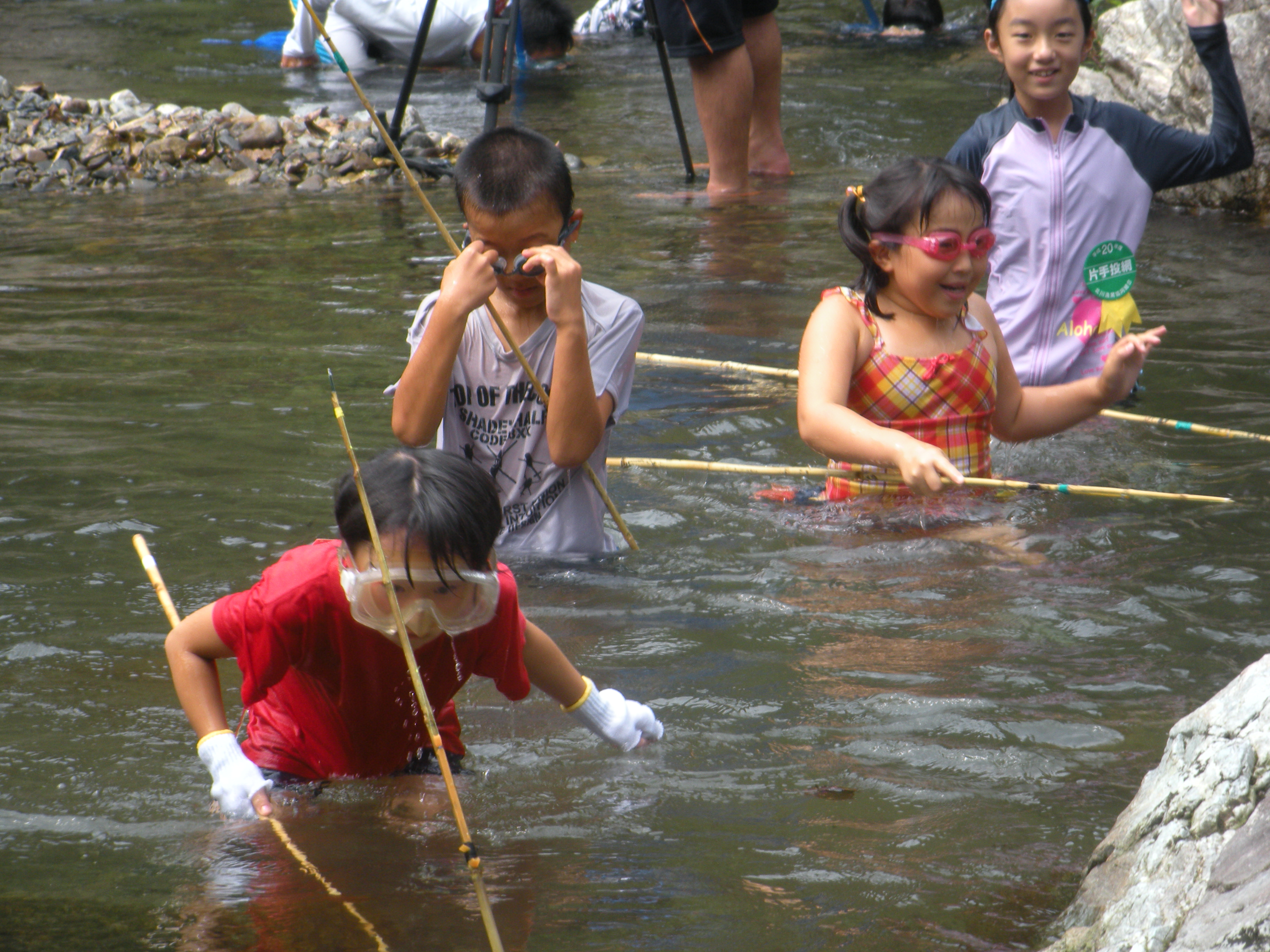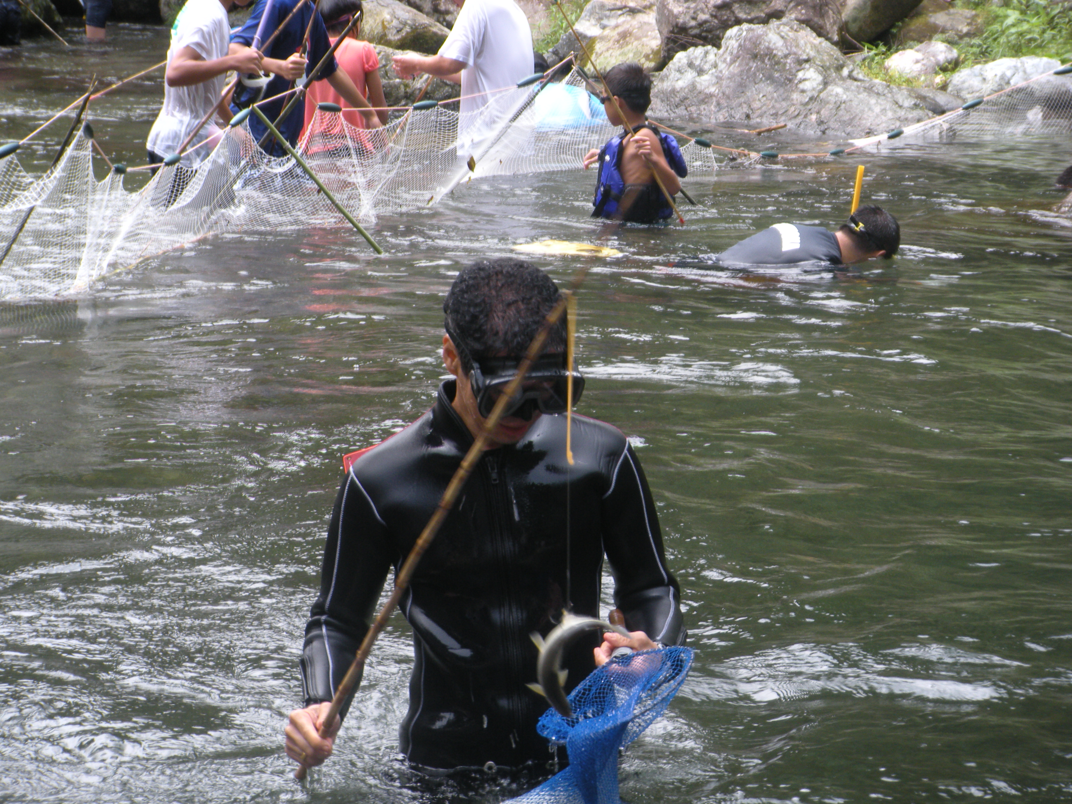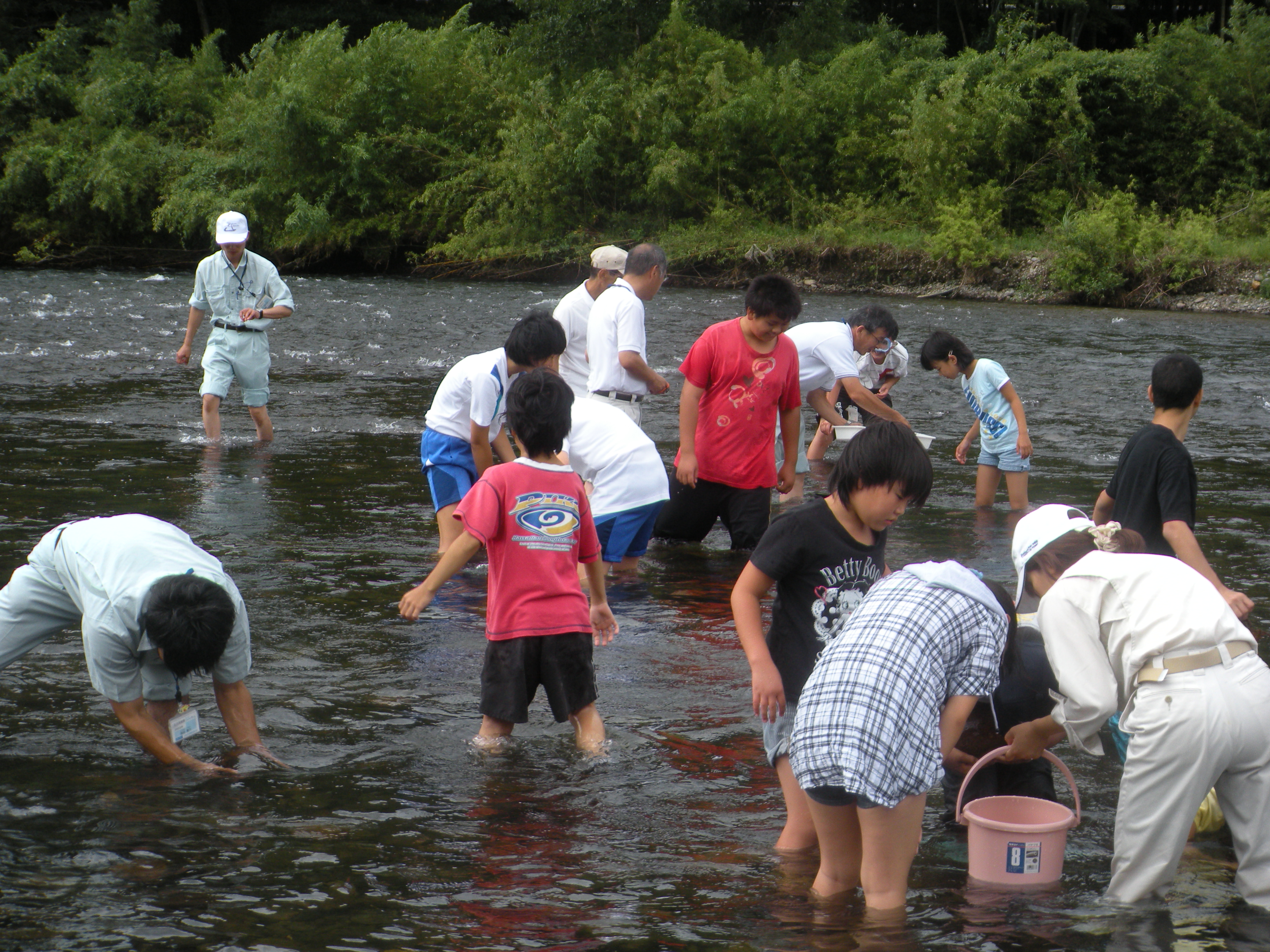 各班にわかれて、魚類や水生生物を集めて調査しました。