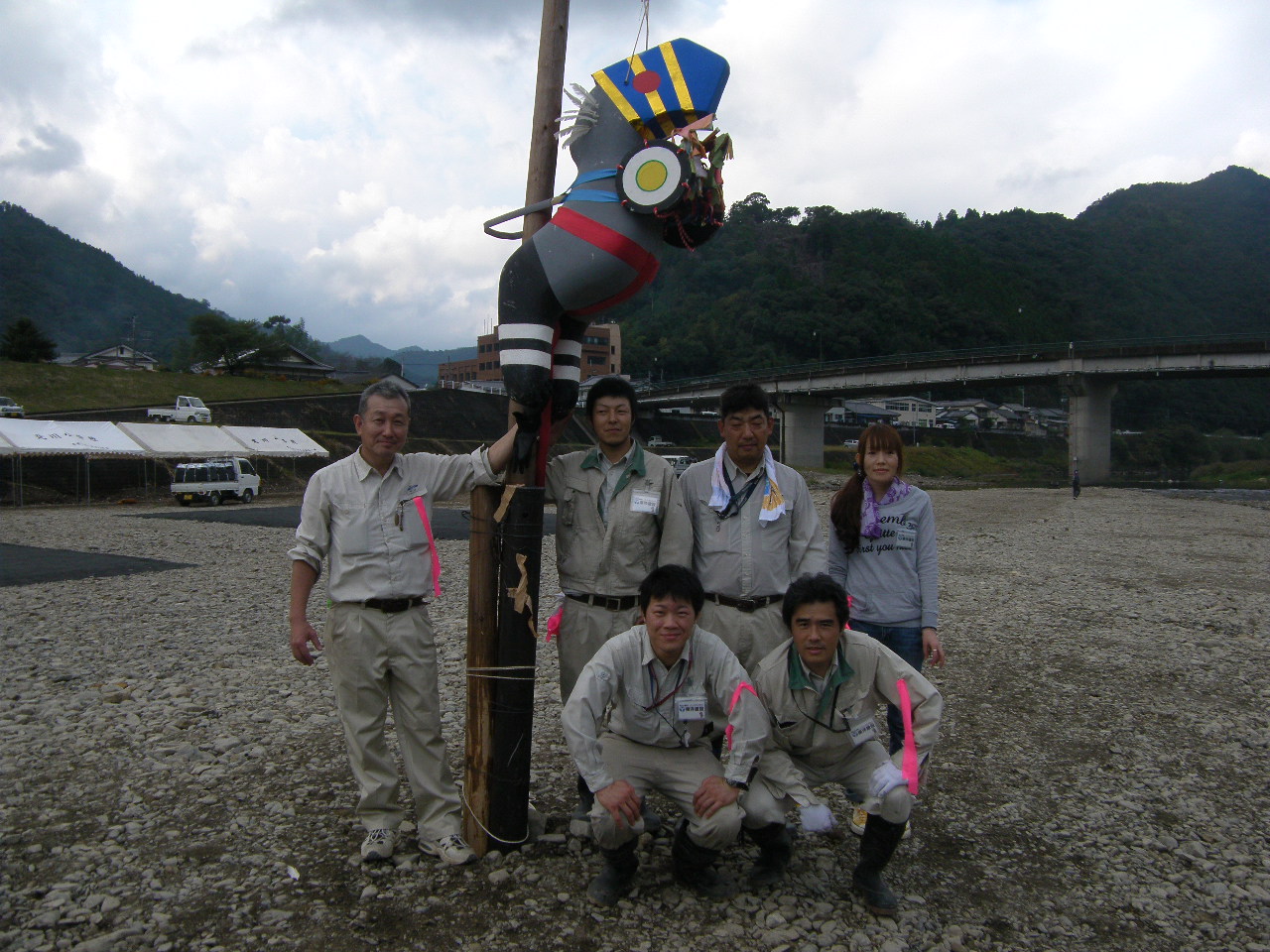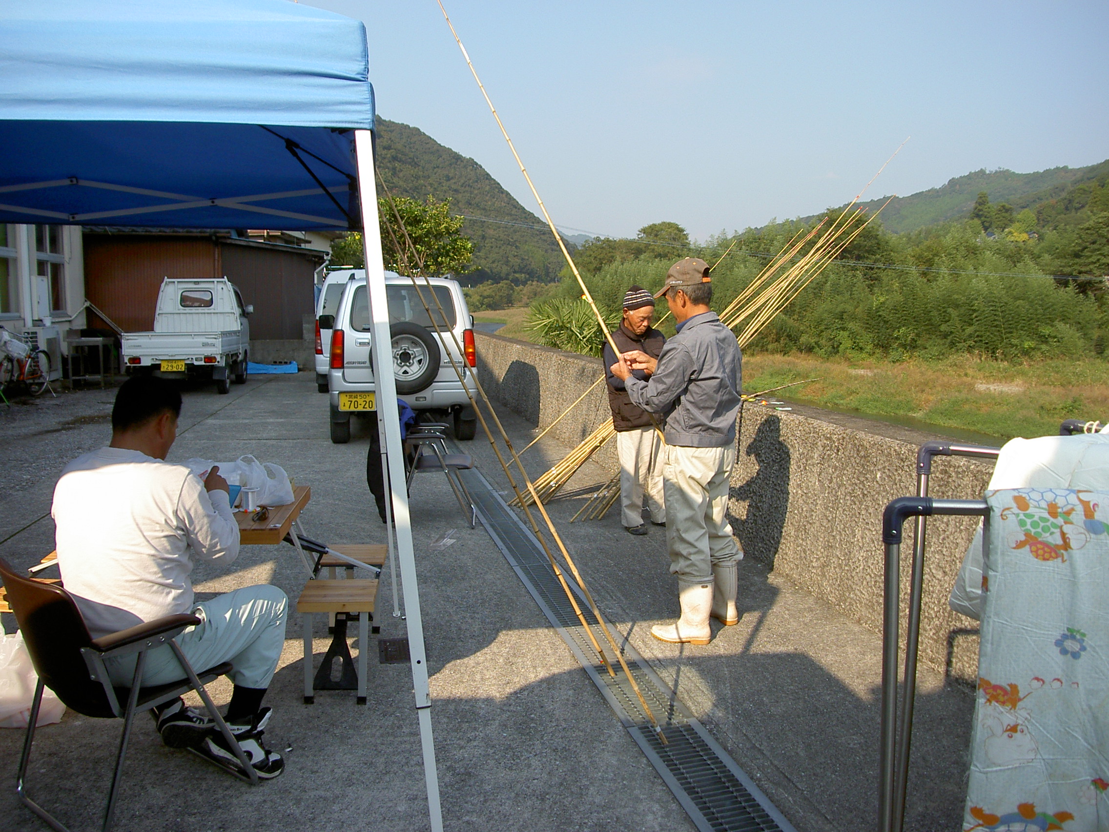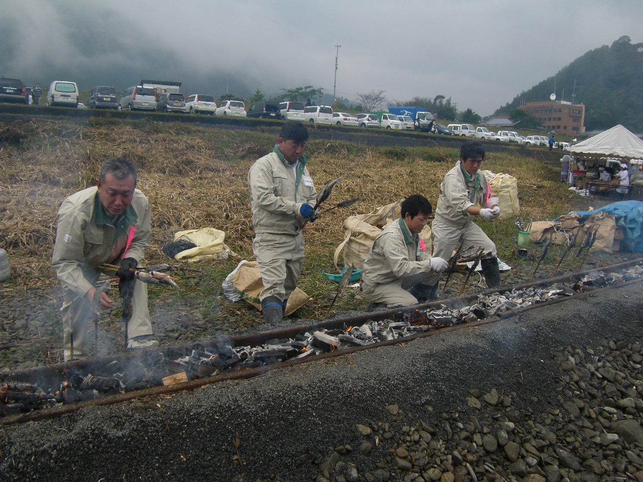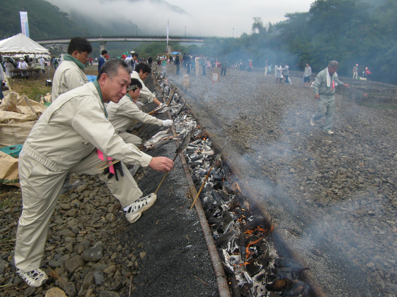 順番待ちの方々には、「こども相撲大会」や「のぼる君ジャンケン大会」、「軽トラ市」や「フリーマーケット」、「発動機展示会」を楽しんでいただき、後半は釣った魚をその場で塩焼きにし、日本赤十字延岡奉仕団の方々が作られた北川鍋やおにぎりと一緒に賞味、北川伝統漁法であるチョン掛けの体験や、ニジマスと山太郎ガニのつかみ捕り、最後は魚撒きなどで楽しんでいただけたのではないかと思います。