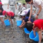 水生生物調査を行い、その後交流会としてニジマスのつかみ捕りをし、ヤマメの放流を体験していただきました。