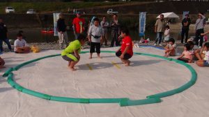 【イベント内容】ニジマス釣り、カヌー体験、子ども相撲稽古披露、ニジマスつかみ捕り、宝探し